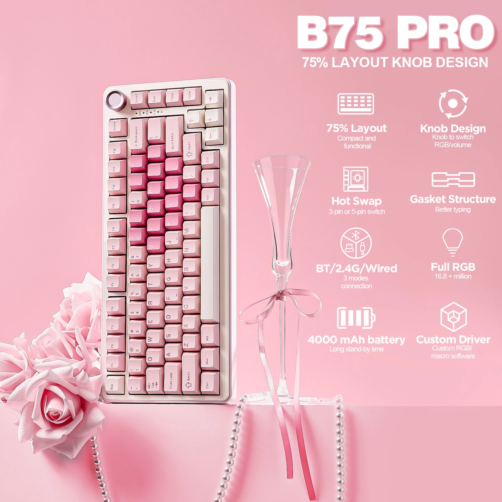 Pink Mechanical Gaming Keyboard, Bluetooth/Wire/Wireless 75 Knob RGB Keyboard