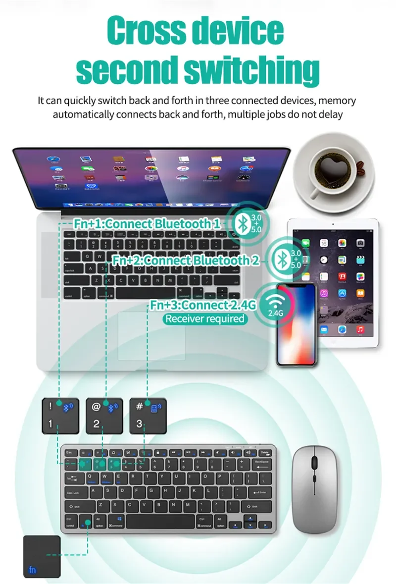 * Wireless 2.4G + bluetooth 3.0 + bluetooth 5.0 three connection methods, which can be connected to tablet, notebook, computer and other devices.